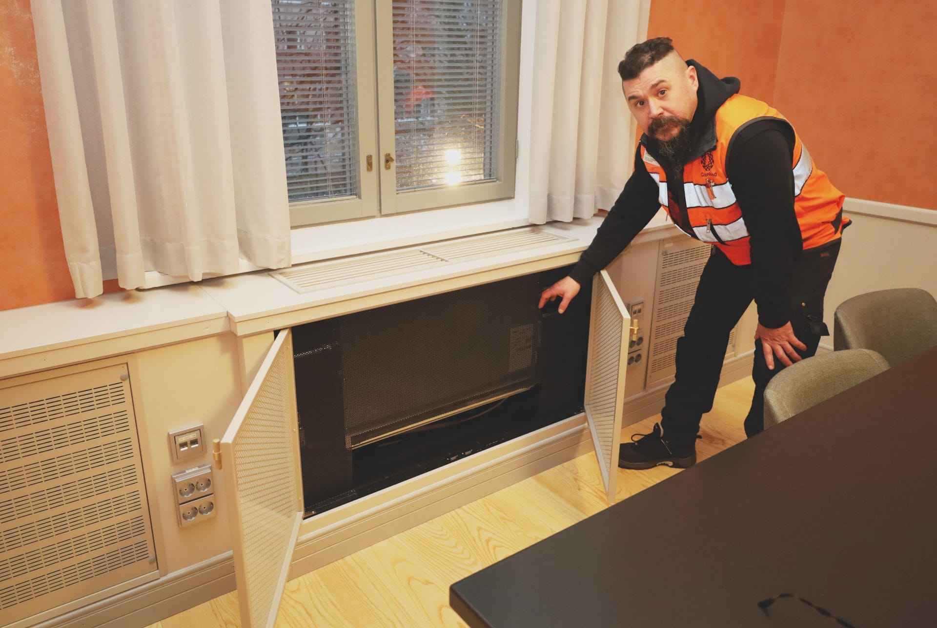 Kaupungintalon kokoustilassa lämmityksen ja jäähdytyksen puhallinkonvektorit on integroitu vaaleasävyiseen ikkunapenkkiin. Pasi Makkonen avaa säleikköjä, jotka piilottavat puhallinkonvektorit. Kuva: Piritta Vainio
