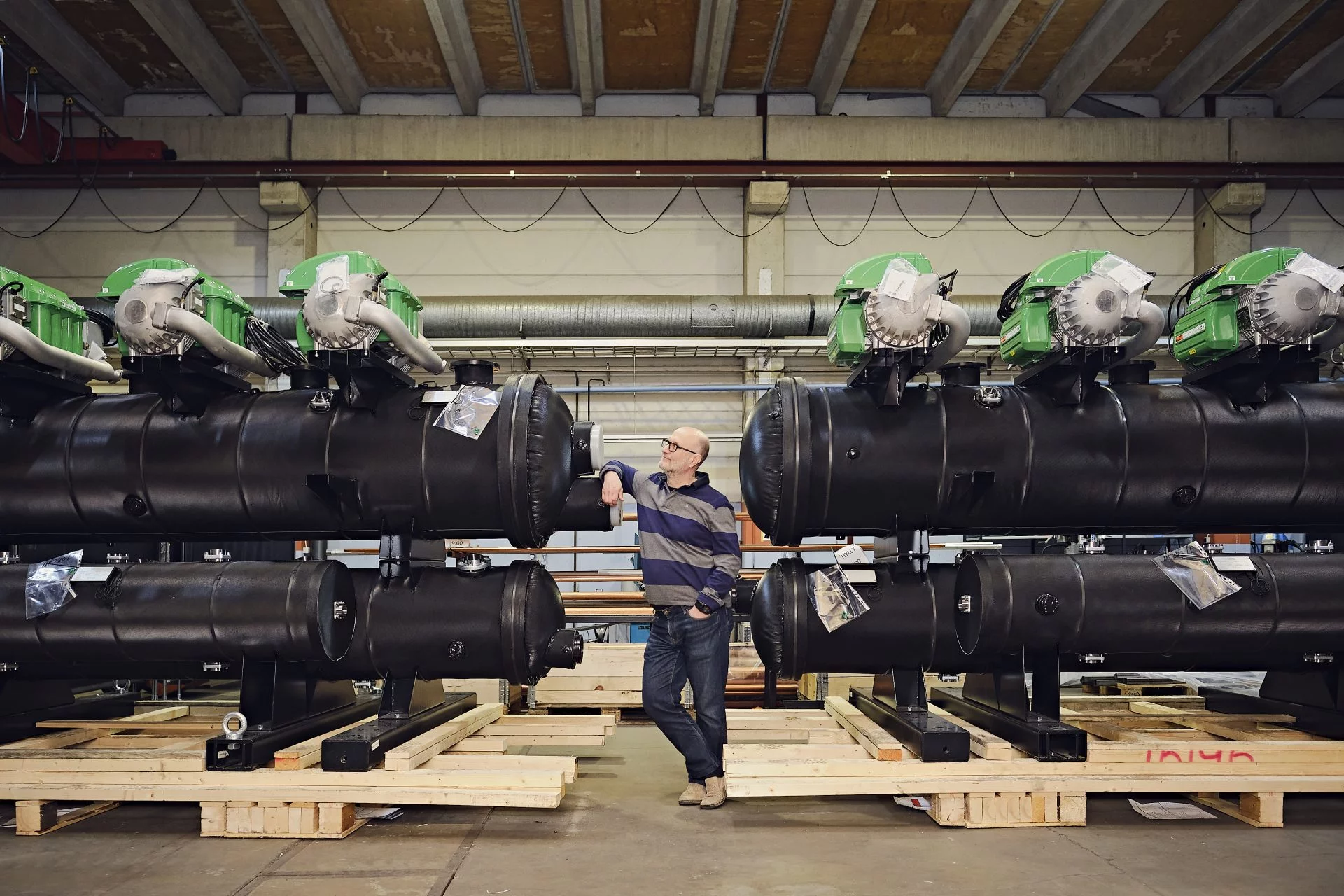 Kuvassa on yli megawatin kokoluokan lämpöpumppuja Energy Machinen tehtaalla Porvoossa. Pumput ovat matkalla aluelämpökeskukseen tekemään kaukolämpöä. ”Muissa kohteissa samoja pumppuja on hyödynnetty myös jäähdytykseen”, yrityksen tuotevastuupäällikkö Mika Kapanen kertoo.