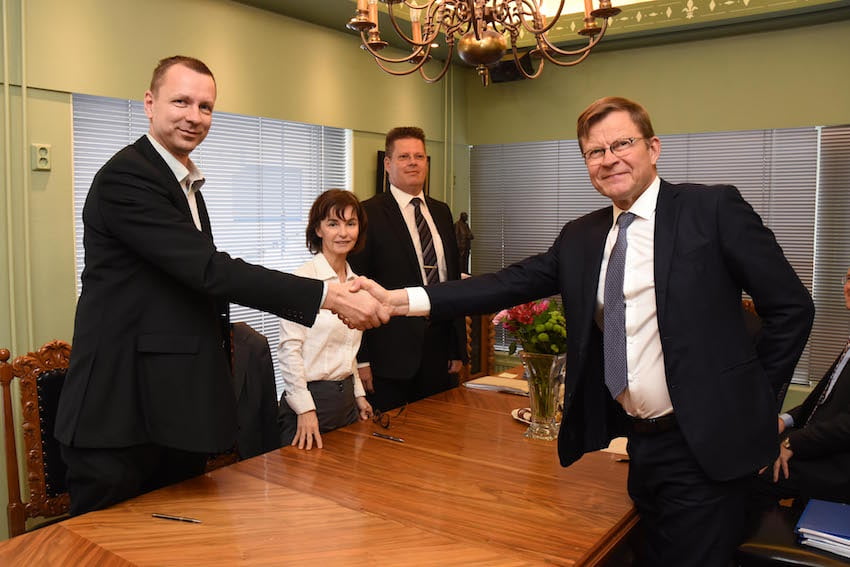 Kuvassa Reposen tekninen johtaja Hannu Saari (vas.), Reposen hankintainsinööri Paula Airaksela, Reposen toimitusjohtaja Mika Airaksela sekä Arktan hallituksen puheenjohtaja, rakennusneuvos Esa Kiiveri.
