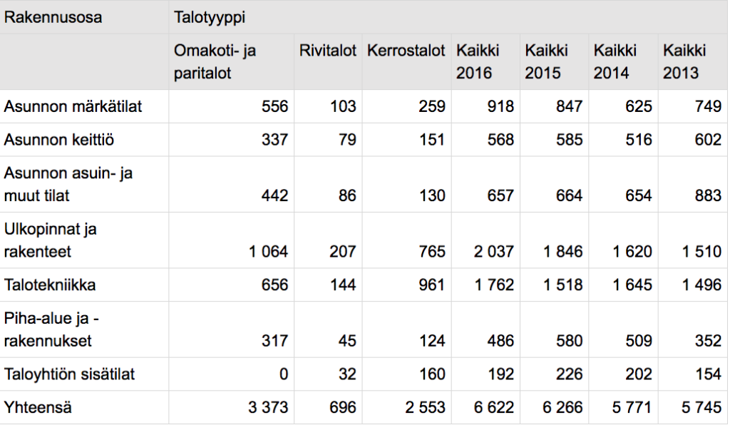 Tilastokeskuksen mukaan asunnon omistajat ja asunto-osakeyhtiöt korjasivat asuntojaan ja asuinrakennuksiaan 6,6 miljardilla eurolla vuonna 2016. Yhteenlasketut korjauskustannukset kasvoivat 5,7 prosenttia vuoden 2015 tasosta ja ne ovat kasvaneet 15,2 prosenttia vuodesta 2013.