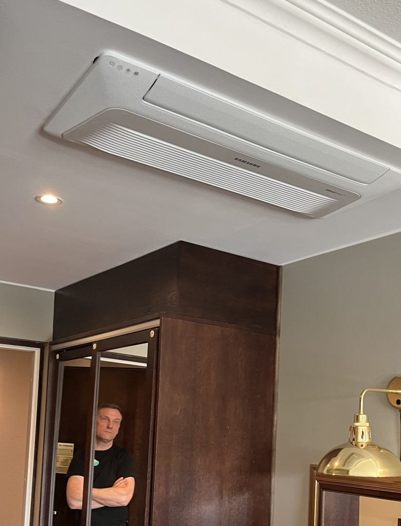 – Kun viileää ilmaa puhalletaan kasetin lävitse ja kapeasta eteiskäytävästä muualle hotellihuoneeseen, tällainen yksikkö soveltuu sinne loistavasti. Yksikkö asennetaan upottamalla kasetin runko kattoon. Samsungin malli on kooltaan matala, joten sen asennus on mahdollinen pieneenkin tilaan.