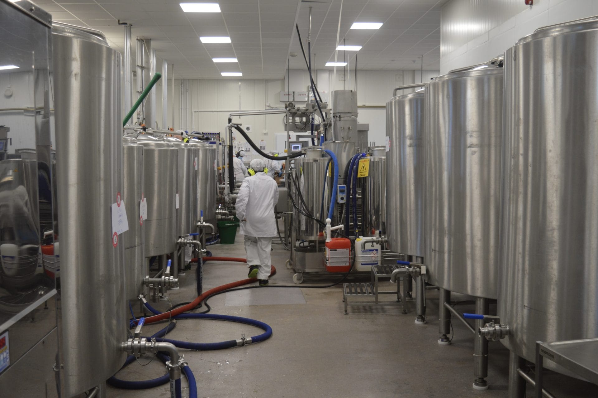 Olemme pukeutuneet toimiston puolella suojavarusteisiin eli valkoiseen haalarin ja suojamyssyyn. Siirrymme tarkastelemaan suuria, metallisia säiliöitä eli kypsytyssäiliöitä, joissa jäätelömassa syntyy. Nestemäinen jäätelömassa on pastöroitu ennen kypsytystä.