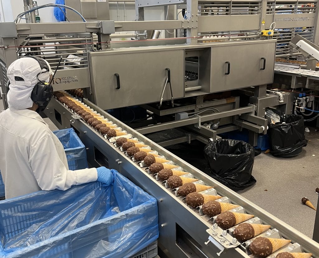 – Sen jälkeen valmistetaan tuote: Suklaata tai muuta täytettä sisälle, päälle jäätelömassaa ja kastiketta, tamppariin, spiraaliin ja jäätelö on valmis. Tuote pakataan ja säilytetään –22…–25 asteisessa varastolämpötilassa, kunnes se lähtee jakeluun.