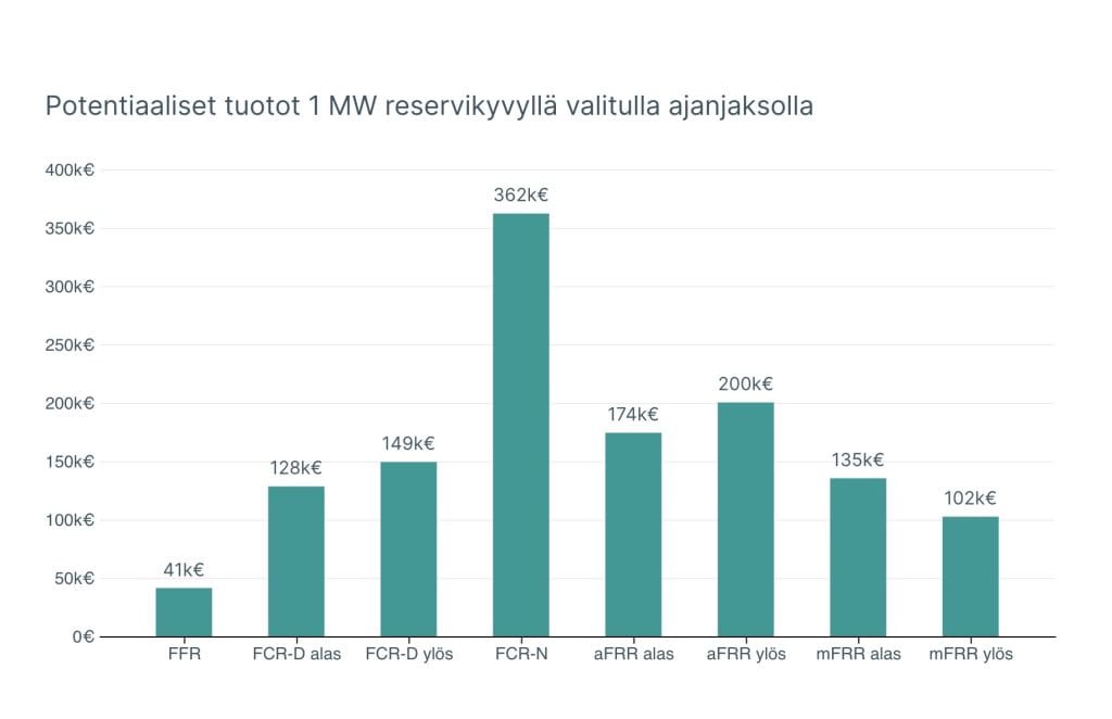 Vuoden 2024 huhtikuun ja vuoden 2025 maaliskuun välisenä aikana 100 kilowattitunnin akulla on voinut ansaita reservimarkkinakorvausta 36 200 euroa taajuusohjatulla käyttöreservillä FCR-N. Fingrid suorittaa reservimarkkinakorvauksen aina palveluntarjoajalle, joka ottaa korvauksesta oman osansa.