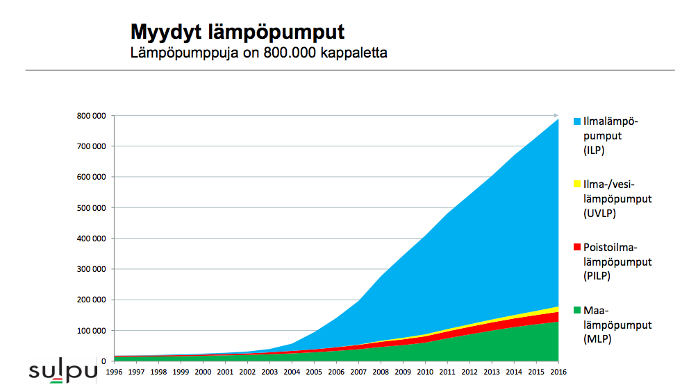 Rakentamisen, talouden ja yleisen mielialan alhosta sekä halvasta öljystä muutamia vuosia kärsinyt lämpöpumppujen myynti kääntyi taas nousuun. Viime vuonna myytiin yli 60 000 lämpöpumppua. Kuluttajat investoivat niihin 350 miljoonaa euroa.