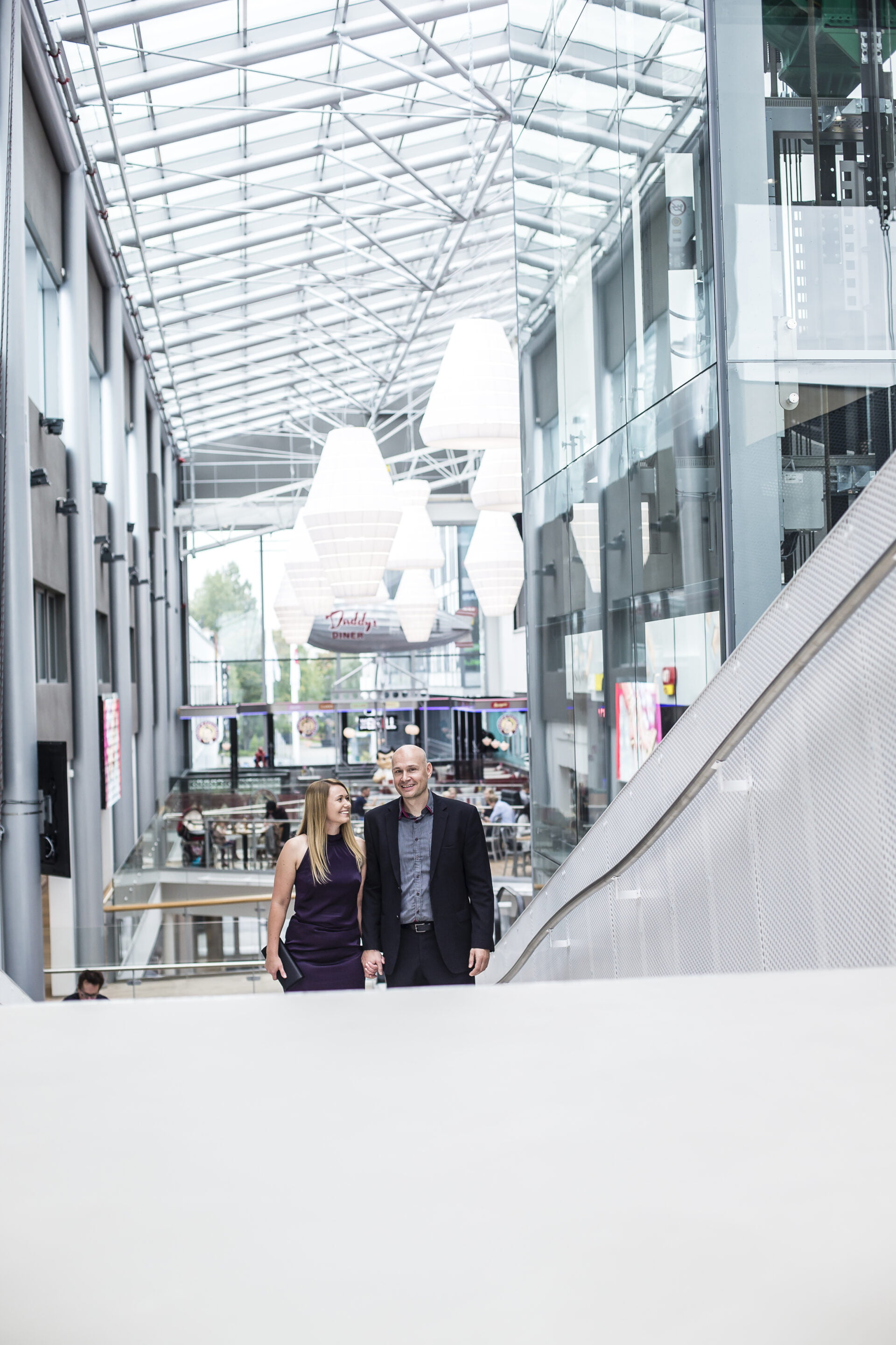 Tunnelma muuttuu jo ylimpään kerrokseen johtavassa portaikossa. Väreiltään ja laajoilta pinnoiltaan levollinen yleisölämpiö poikkeaa alakerran ilmapiiristä. Kauppakeskuksen hälinää ei kuitenkaan kokonaan suljeta ulkopuolelle: Lämpiö avautuu kauppakäytävälle, ja virvokettaan voi siemailla aaltomaisen verkkokaiteen vierellä.