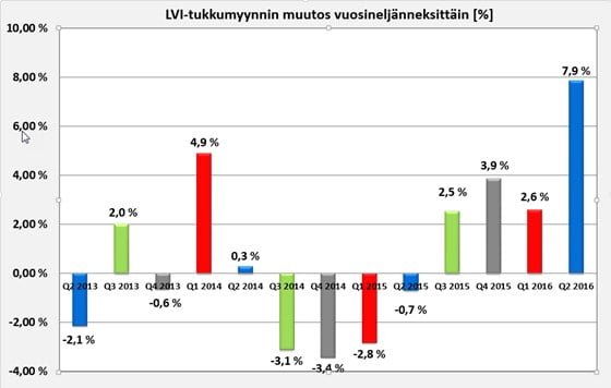 LVI-teknisten tuotteiden tukkumyynnit vuoden toiselta kvartaalilta vahvistivat rakentamisen kasvun merkkejä. Toisen kvartaalin LVI-teknisten tuotteiden tukkumyynnin kokonaisarvo oli 271 miljoonaa euroa, joka on 7,9 prosenttia enemmän kuin vuoden 2015 vastaavalla ajanjaksolla.
