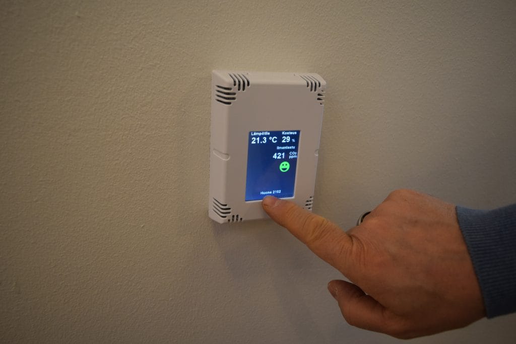 – Huonesäätimet monitoroivat olosuhteista käyttäjälle visuaalisesti. Raja-arvot on aseteltu suositusten mukaisesti, seuraten lämpötilaa, kosteutta ja hiilidioksidia.