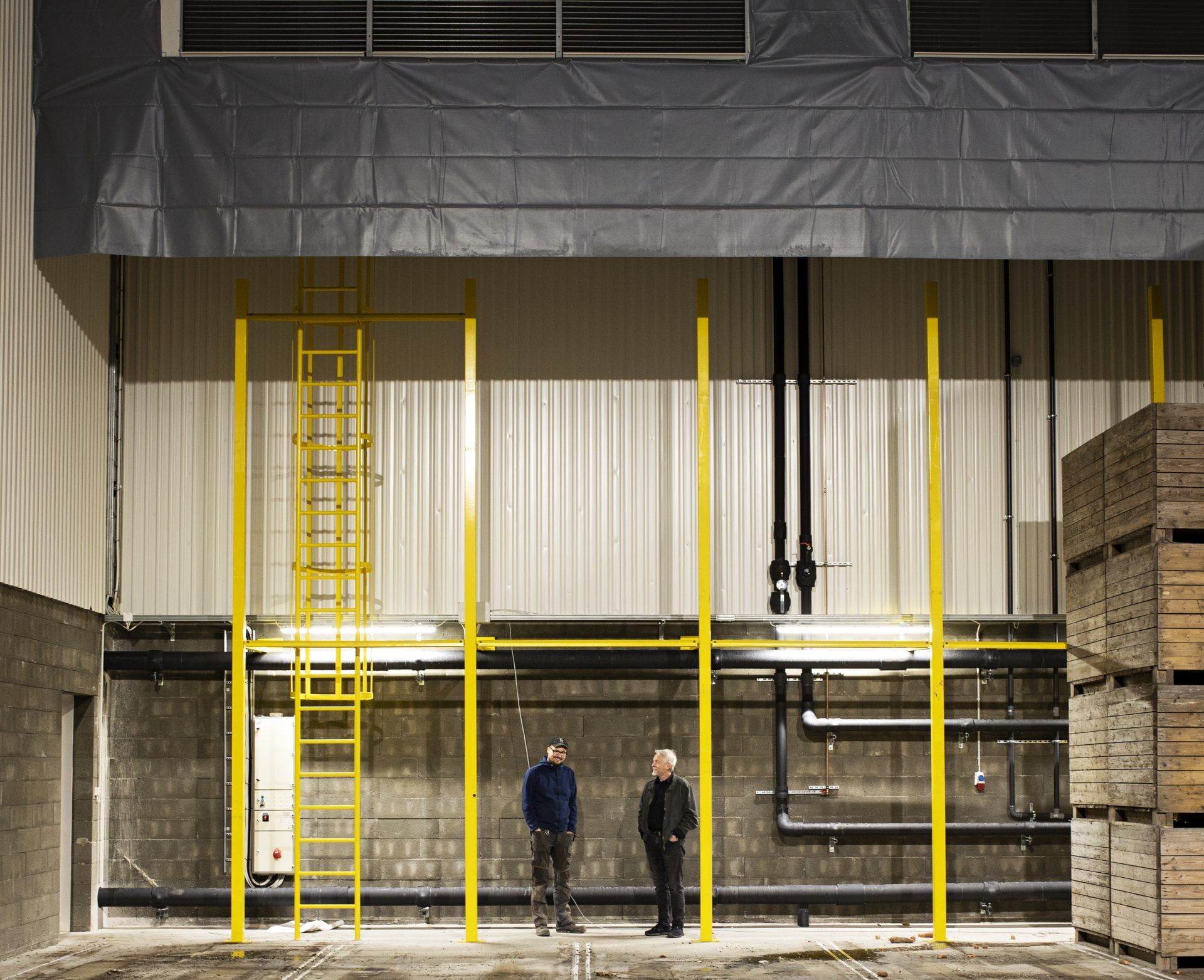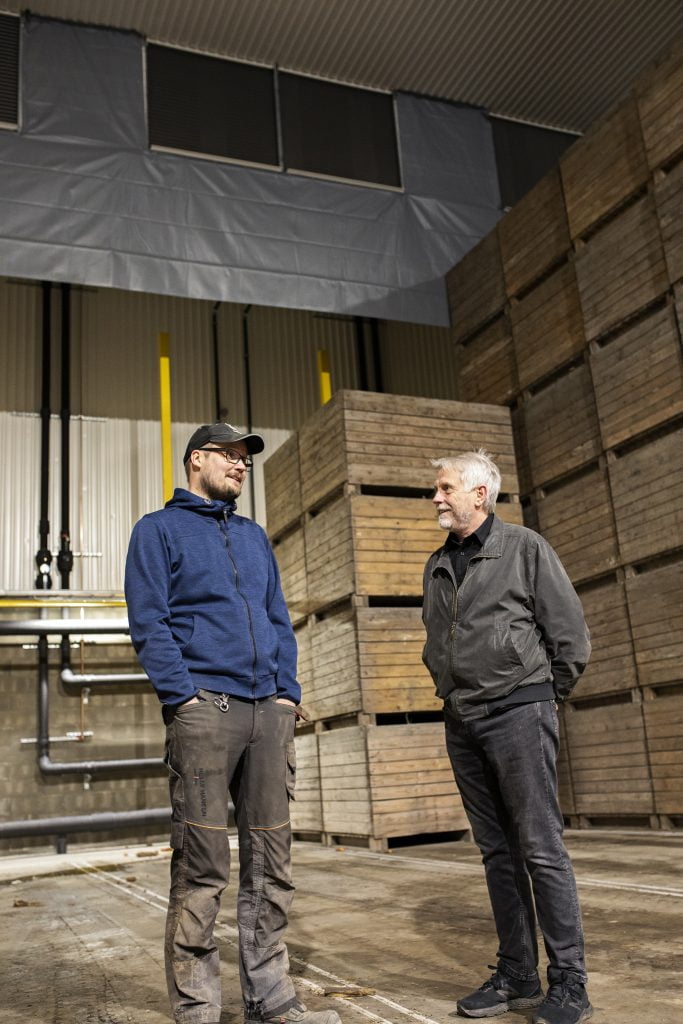 Kylmävaraston katonrajassa on patterit, joiden avulla kylmä ilma tuodaan varastoon. Pattereita ympäröivät pressut ohjaavat ilman laatikoiden päälle. Kuvassa vasemmalla Miika Lassila ja oikealla Jari Haavisto. Kuva: Suvi Laine.
