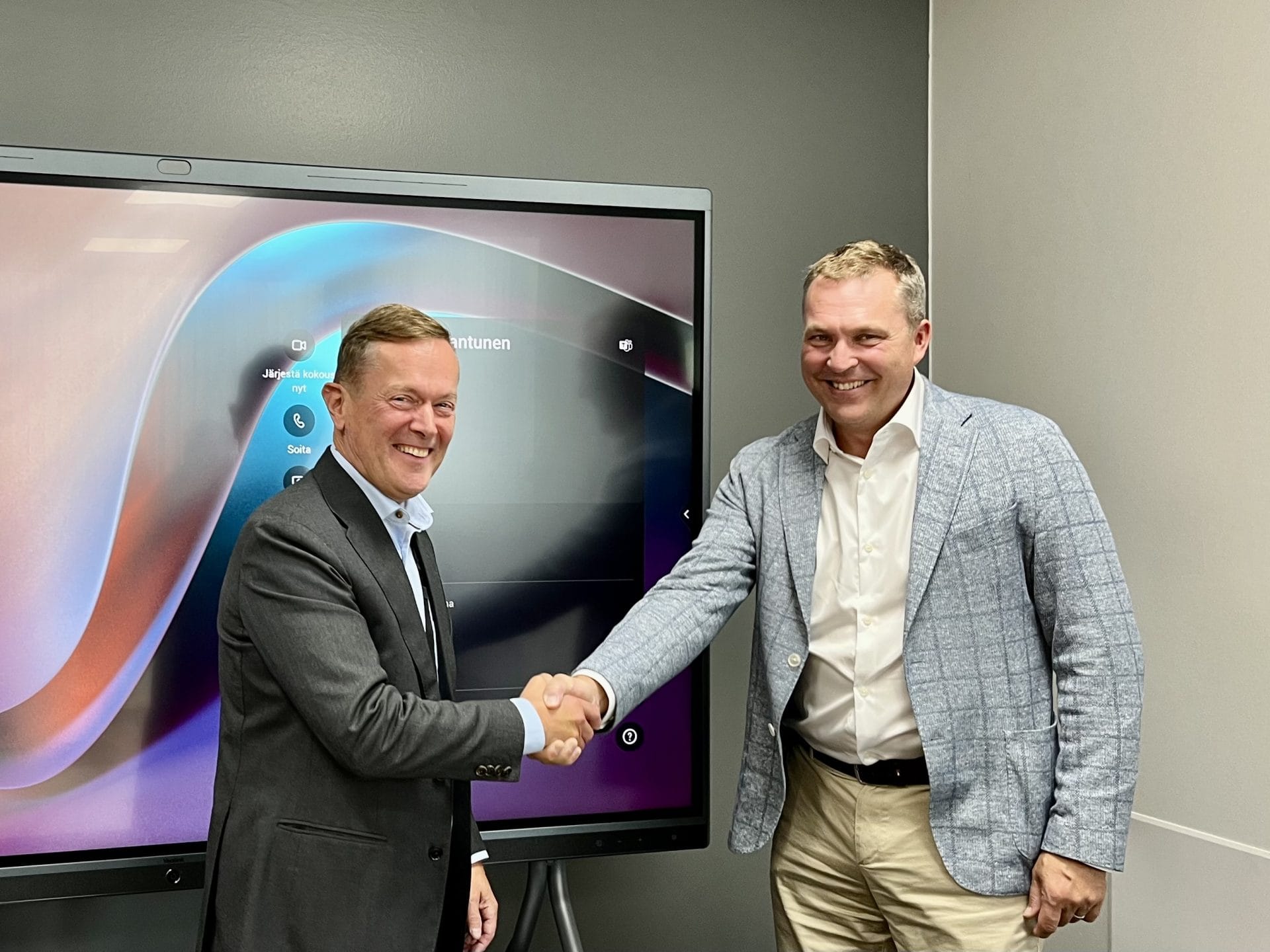 Norelcon toimitusjohtaja Ari Hämäläinen ja Schneider Electric Suomen toimitusjohtaja Jani Vahvanen kertoivat viime viikolla yritysten välisestä lisenssisopimuksesta. Kuva: Miia Manner