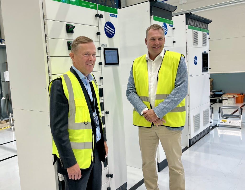 Norelcon toimitusjohtaja Ari Hämäläinen (vas.) näkee uuden tuotannon tärkeänä osana kasvustrategiaansa ja laajentumistaan Pohjoismaihin. Kuvassa oikealla Schneider Electricin Suomen toimitusjohtaja Jani Vahvanen. Kuva: Miia Manner