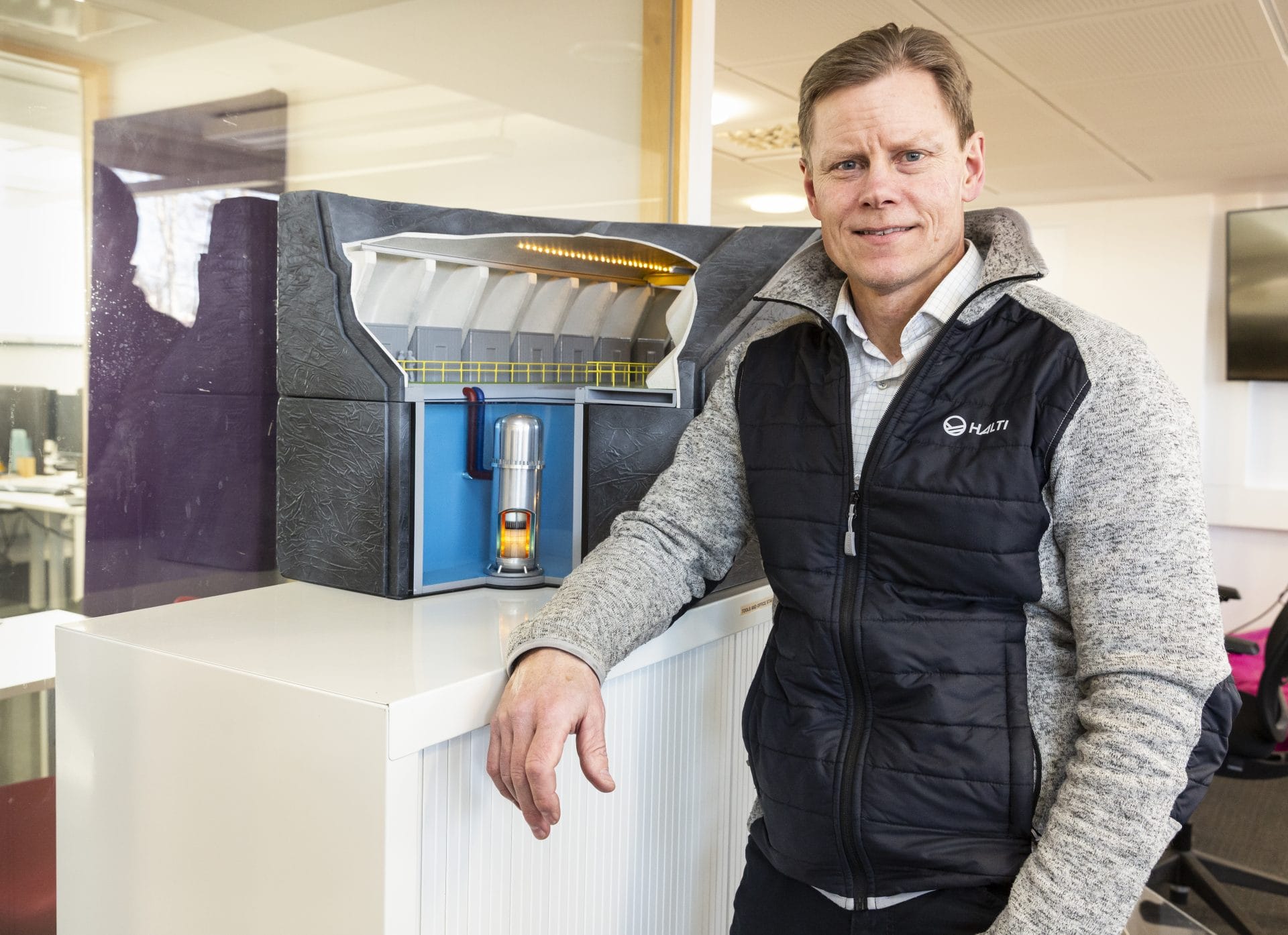 Tommi Nyman ja Steady Energyn kehittämän pienydinvoimalan pienoismalli. Parvella olevat ihmisfiguurit auttavat laitoksen mittakaavan hahmottamisessa. Kuva: Vilma Timonen
