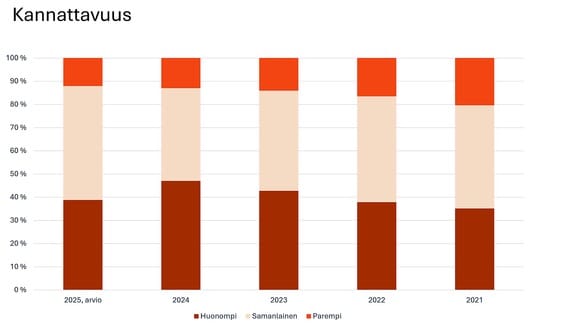 Kiristynyt kilpailu syö alan yritysten kannattavuutta. Lähes puolet arvioi sen pysyvän ennallaan, kasvua odottaa vain 12 %. Isompia yrityksiä lukuun ottamatta kaikki vastaajaluokat liikevaihdoittain odottavat tilanteen heikkenevän saldoluvuilla mitattuna.