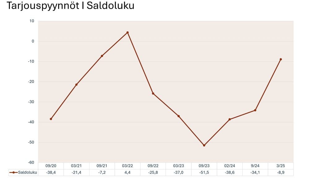Tarjouspyyntöjen määrä on kasvanut viime syksystä, saldoluku on enää hieman negatiivinen (syksy 2024 -34,1 ja kevät 2025 -8,9). Alueelliset näkymät vaihtelevat huomattavasti: positiivisin tilanne on Lapissa, Etelä-Karjalassa, Keski-Pohjanmaalla sekä valtakunnallisilla toimijoilla.