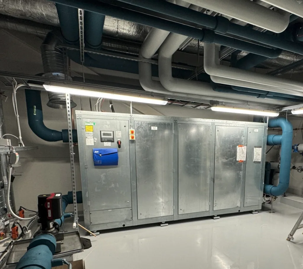 Uudiskohteeseen asennettu uudelleenkäytetty vedenjäähdytyskone. Kuva: Granlund