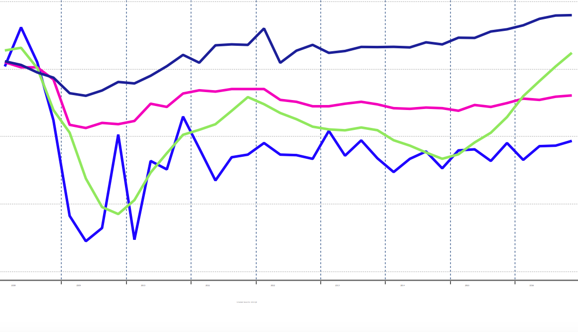 Kuvassa: Suomen viimeaikainen kasvu on ollut erityisesti yksityisen kulutuksen ja rakentamisen ansiota. Vihreä käyrä kuvaa rakentamista.