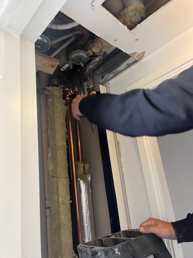 – Voi myös olla, että linjasäätö on liian pienellä, Heikkilä pohtii ja päättää kollegansa kanssa, että naapuriasunto, missä tehdään parhaillaan remonttia, kannattaa vielä tarkastaa.