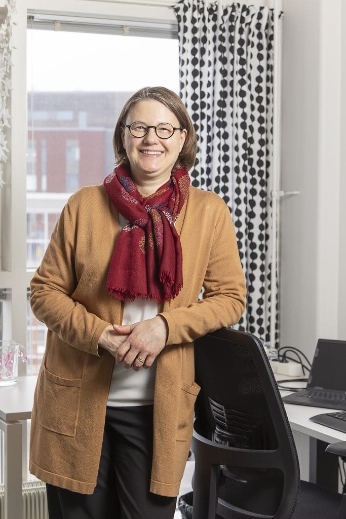 ”Näillä kilometreillä olen nähnyt jo monenlaista ja ollut monessa työpaikassa. Takkiin on kertynyt kokemusta ihmisistä, johtajista, johtamisesta, organisaatioista, ihmisten kanssa toimimisesta, ihmisiin vaikuttamisesta ja kouluttamisesta”, sanoo Katja Kurki-Suonio. Kuva: Cristian Hallivuori
