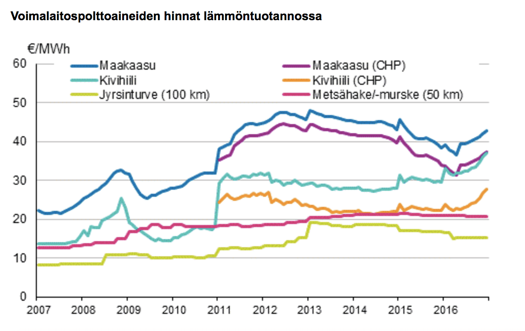 Lämmöntuotannossa käytettävän kivihiilen ja maakaasun hinnat nousivat vuoden 2016 alun valmisteveron nousun sekä verottomien hintojen nousun myötä.