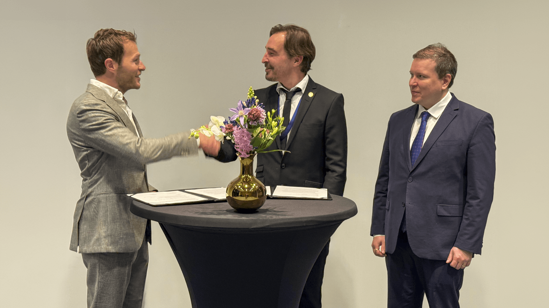 Jan Willem de Jong ja Arttur Kulvik aiesopimuksen allekirjoitustilaisuudessa. Mukana myös ulkomaankauppa- ja kehitysministeri Ville Tavio. Kuva: Solnet