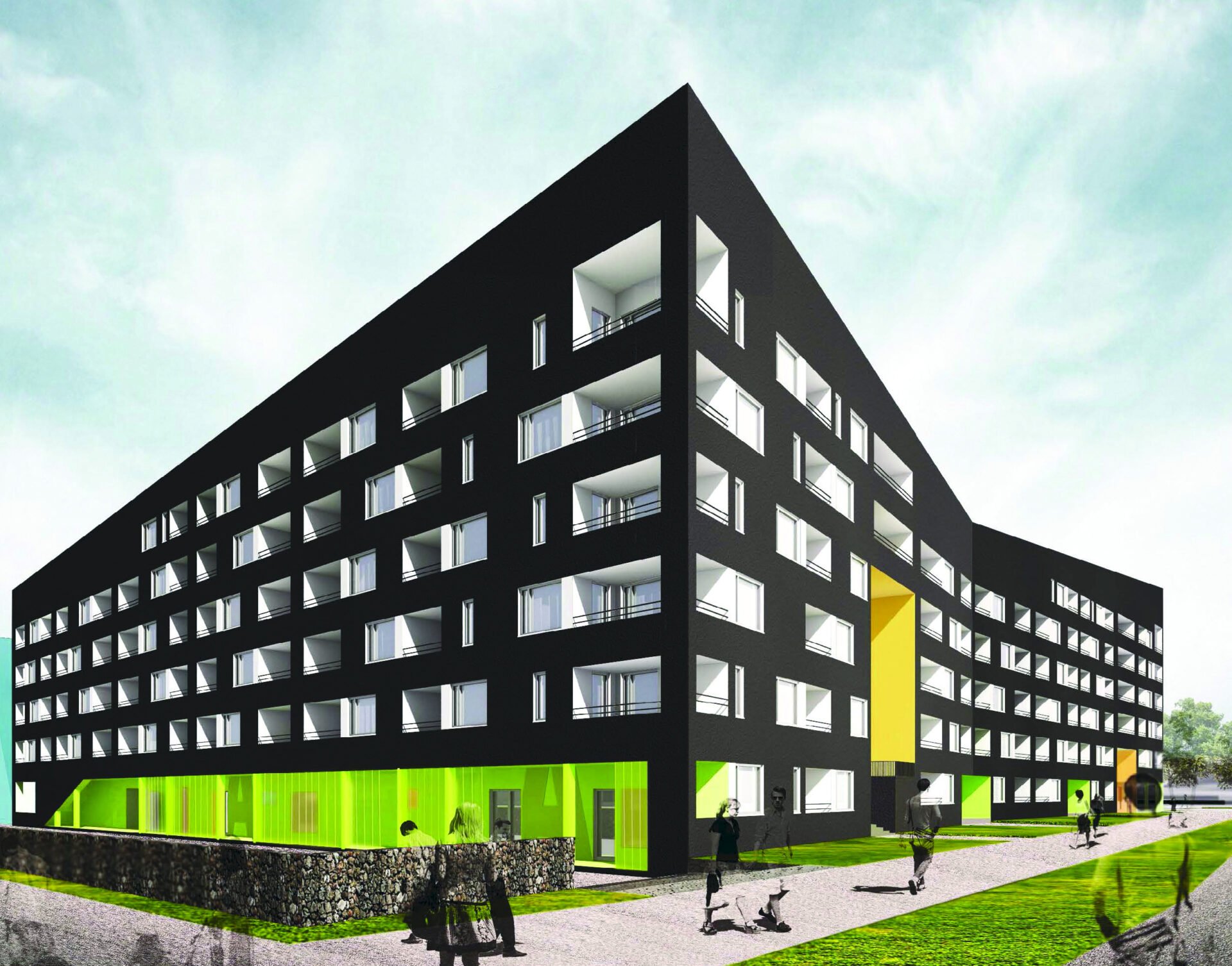 Umpikorttelimaisesti kiertyvä rakennus luo turvallisen ja viihtyisän sisäpihan. Autojen pysäköinti on suunniteltu pihakannen alla olevaan autohalliin ja pintapysäköintinä. Talossa on monipuoliset yhteistilat, kuten monitoimitila, kaksi saunaosastoa, pesula ja kuivaushuoneet sekä lastenvaunu- ja ulkoiluvälinevarastot.