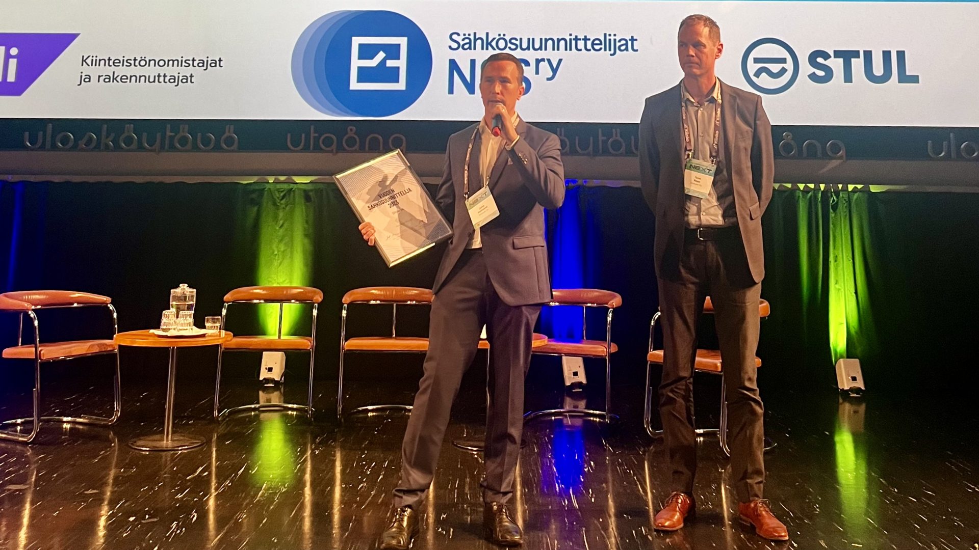 Kunniataulun vastaanottivat sähkösuunnittelun johtaja Tomi Repo ja talotekniikan kehitysjohtaja Juha Kiviniemi Talotekniikka Next -tapahtumassa torstaina. Erityisen maininnan yritys sai vihreän suunnittelun edelläkävijyydestä.
